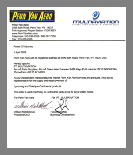 PT. MULTIAVIATION has been appointed as the independent representative for Penn Yan Aero, New York, USA - one of the leading reciprocating engine workshops and is also a Lycoming and Continental engines distributor. Factory engines are available as well.
